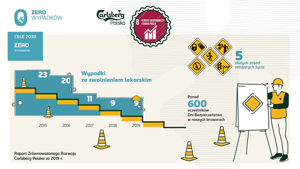 Bezpieczeństwo jest zakorzenione w kulturze pracy w Carlsberg Polska. Wszystkie browary firmy posiadają m.in. certyfikowany System Zarządzania Bezpieczeństwem i Higieną Pracy OHSAS 18001. W 2019 r. firma odnotowała istotny postęp na drodze do osiągnięcia celu ZERO wypadków. Liczba wypadków bez zwolnienia lekarskiego zmniejszyła się o blisko 70%. Ponadto firma zwiększyła zaangażowanie pracowników w dbanie o bezpieczeństwo w miejscu pracy. Liczba obserwacji sytuacji i zachowań potencjalnie niebezpiecznych wzrosła o 261% (blisko 11 000 obserwacji), co pozwoliło wyeliminować wiele potencjalnych zagrożeń.