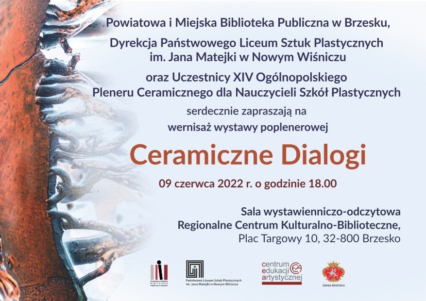 Wernisażem otwarta zostanie wystawa poplenerowa „Ceramiczne Dialogi” prezentująca ceramikę powstałą podczas XIV Ogólnopolskiego Pleneru Ceramicznego dla Nauczycieli Szkół Plastycznych w Nowym Wiśniczu.