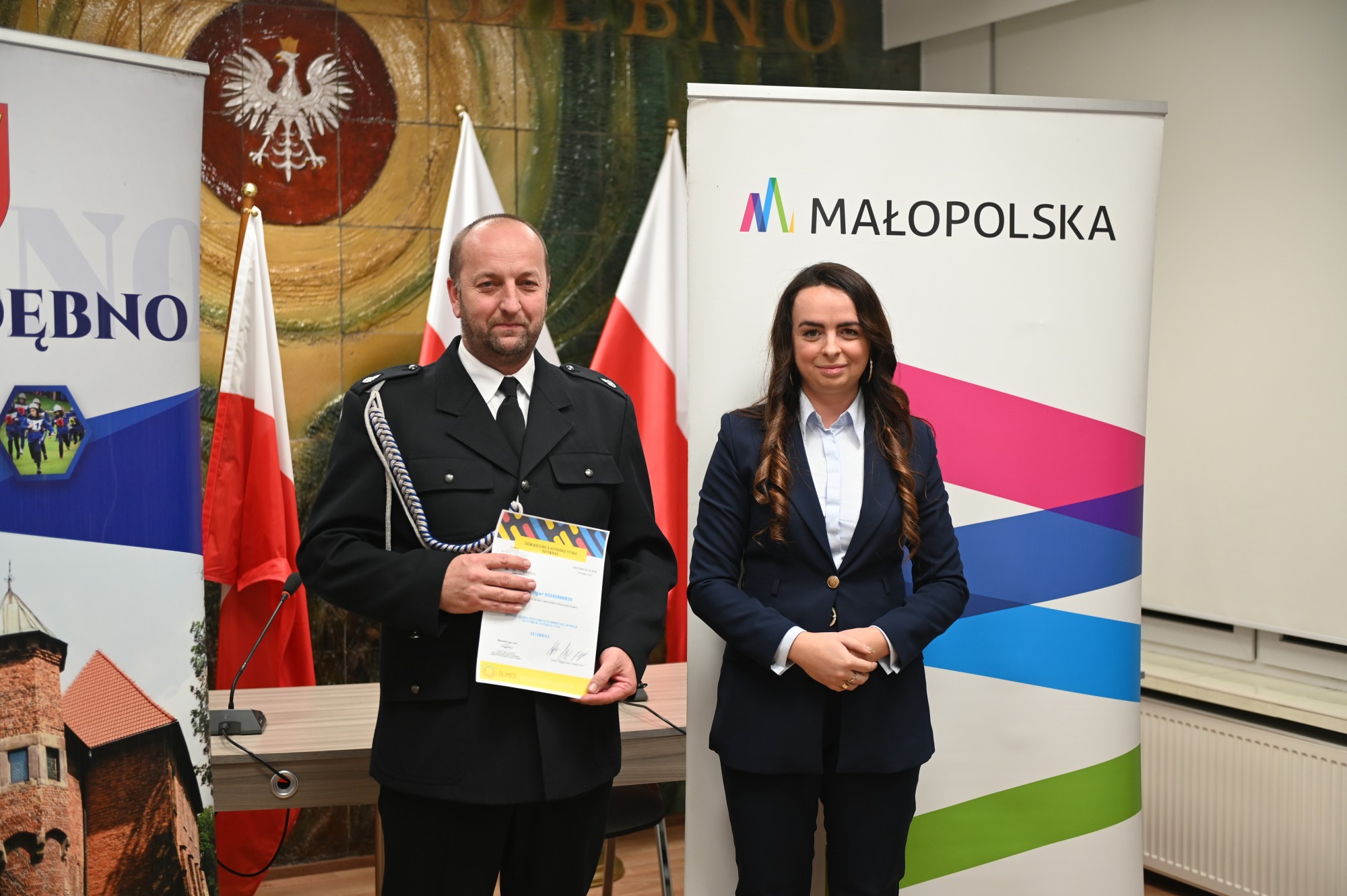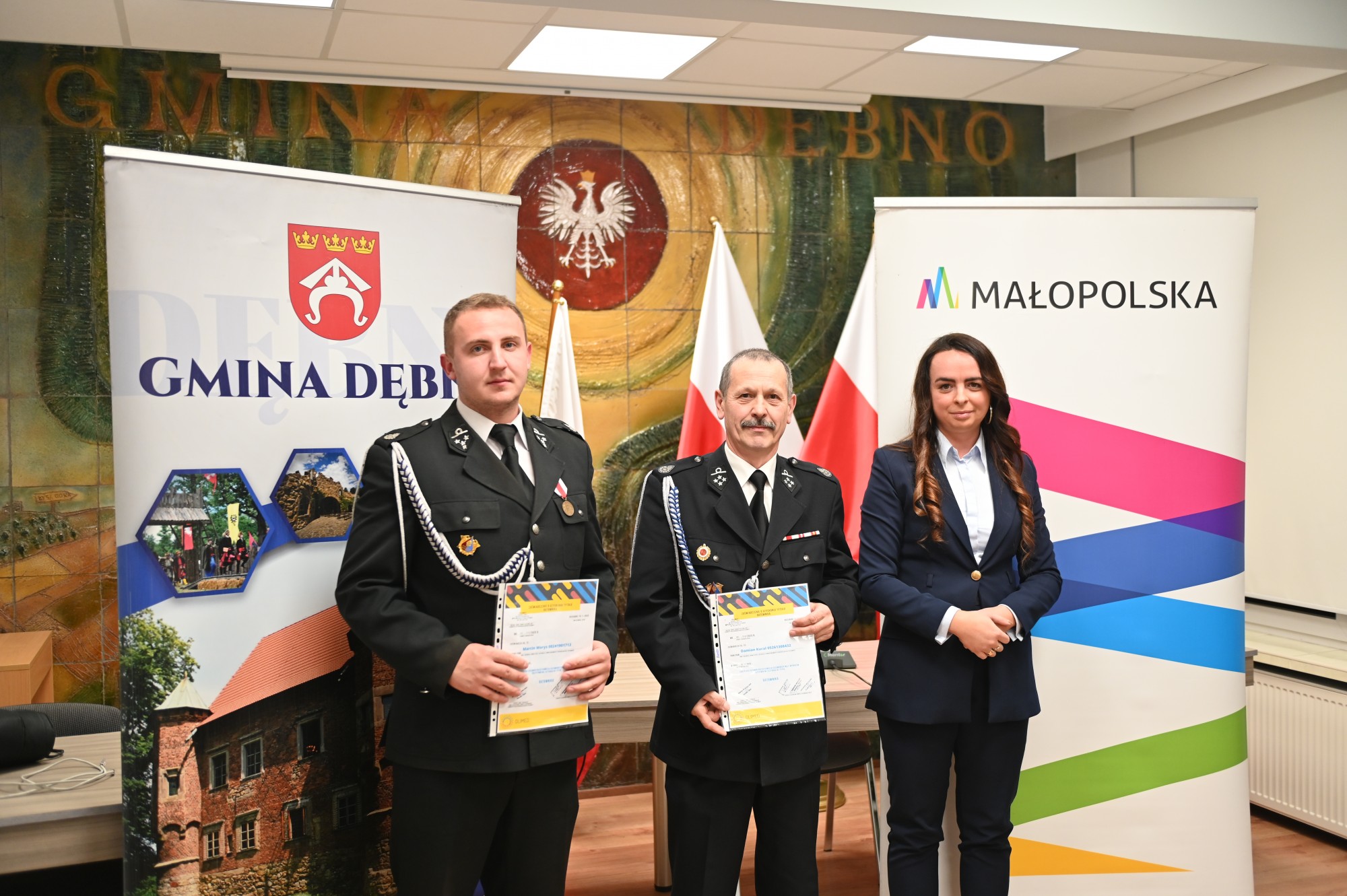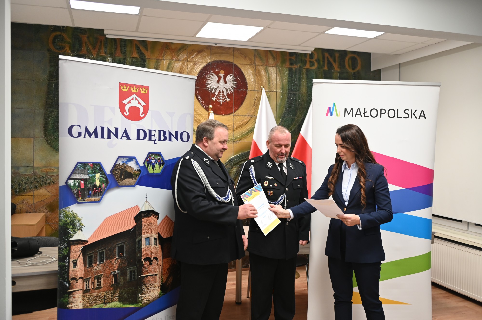 19 grudnia 2025 r. w sali narad Urzędu Gminy Dębno odbyło się uroczyste wręczenie certyfikatów w ramach udzielenia pomocy finansowej dla gmin z przeznaczeniem dla Jednostek OSP pn. „Szkolenie KPP dla każdej Jednostki OSP 2025”. Strażacy otrzymali certyfikaty z rąk Sekretarz Gminy Anny Jakubas.