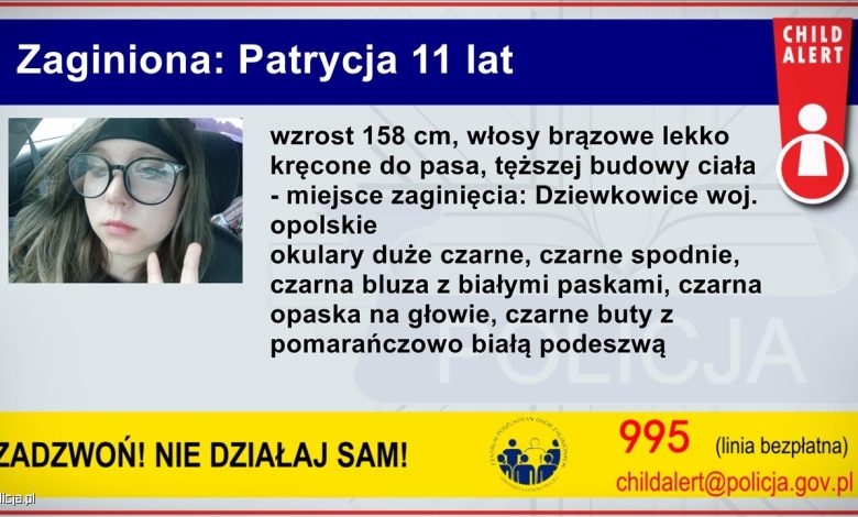 Strzeleccy policjanci poszukują zaginionej 11-letniej Patrycji. Nastolatka zaginęła 13 maja 2025 roku, kiedy to po wizycie u dziadków nie powróciła do domu. Ostatni raz widziana była około godz. 12.30, w miejscowości Dziewkowice. Dziewczynka od tamtej chwili nie nawiązała kontaktu z rodziną.