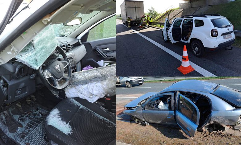 W związku z tym zdarzeniem w miejscu kolizji zrobił się mały zator. Ruch był spowolniony. Nie zauważył tego kolejny kierowca, który dacią jadąc lewym pasem zorientował się, że zbyt późno o tym, że pojazd przed nim niemalże stoi w miejscu. Wykonał gwałtowny manewr obronny w prawą stronę i uderzył w ciężarówkę. Wjeżdżając w jej tył ściągnął pokrywę silnika i niszczył szybę przednią swojego samochodu. I to zdarzenia zostało zakwalifikowane jako kolizja drogowa, ponieważ nikt nie ucierpiał. W tym przypadku pojazdy zostały usunięte na pas awaryjny, a winny 31-latek z powiatu tarnowskiego również został ukarany mandatem karnym.
