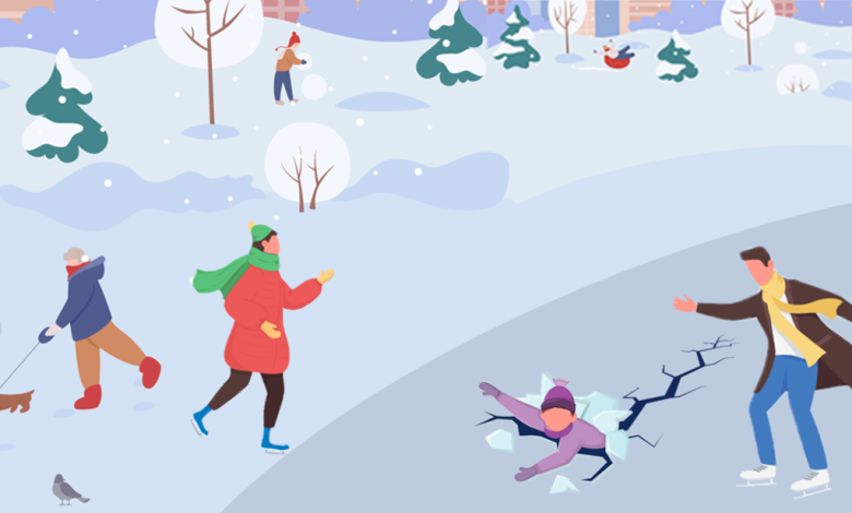 - W przypadku załamania lodu staraj się zachować spokój, jednocześnie głośno wzywając pomocy.