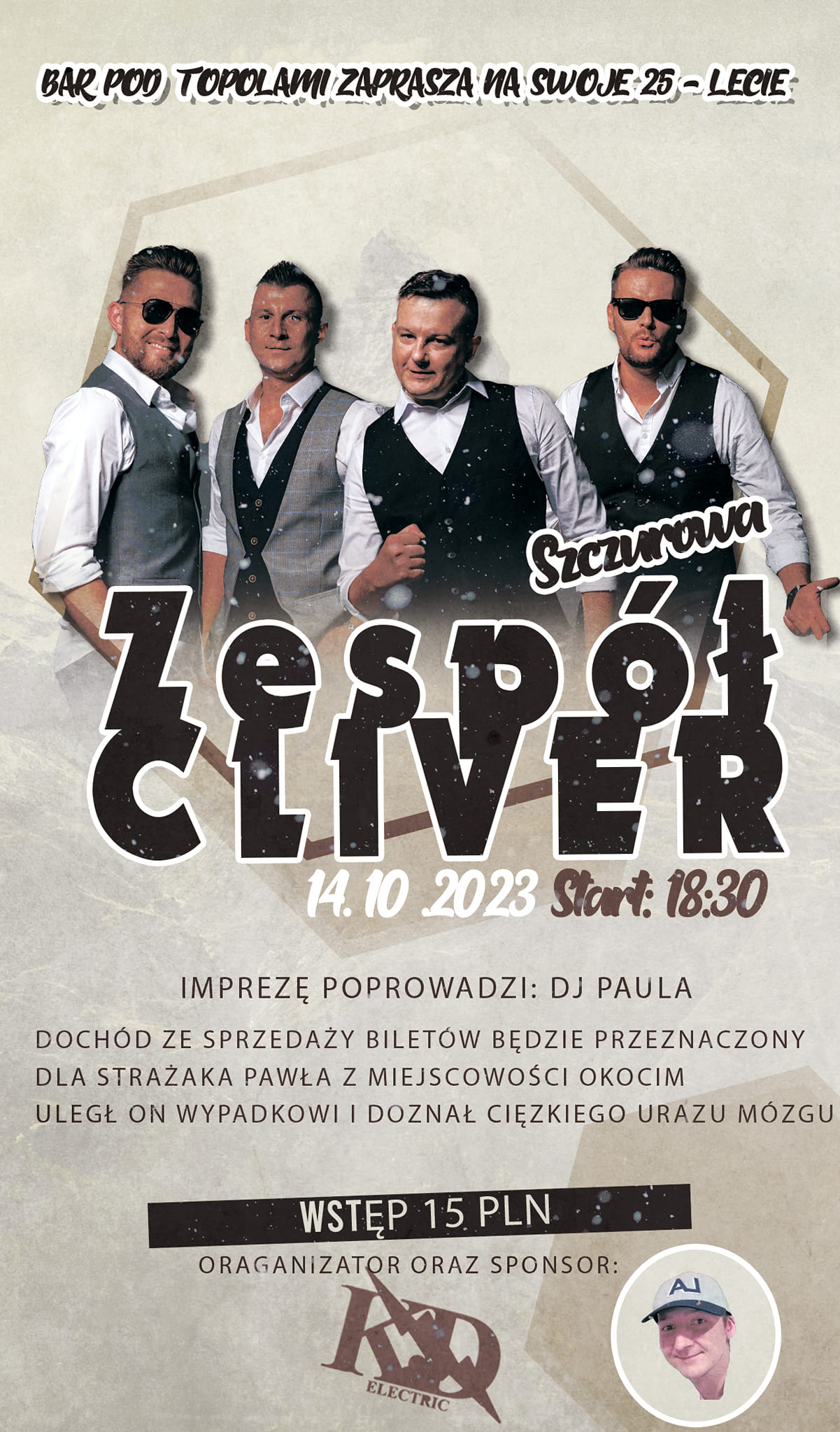 W sobotę 14 października 2023 r. w Szczurowej w Barze Wyrwigrosz pod Topolami odbędzie się impreza muzyczna z okazji 25 lecia lokalu. Gwiazdą wieczoru będzie będzie CLIVER – jeden z najbardziej znanych zespołów disco polo. Bilety wstępu w cenie 15 zł będą cegiełkami na rehabilitację Pawła Piekarczyka, strażaka z Okocimia.