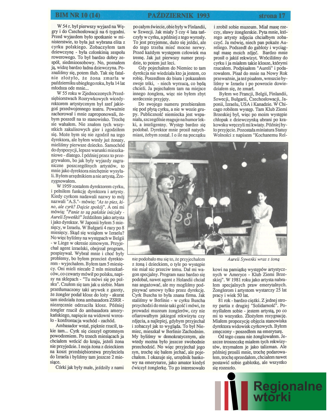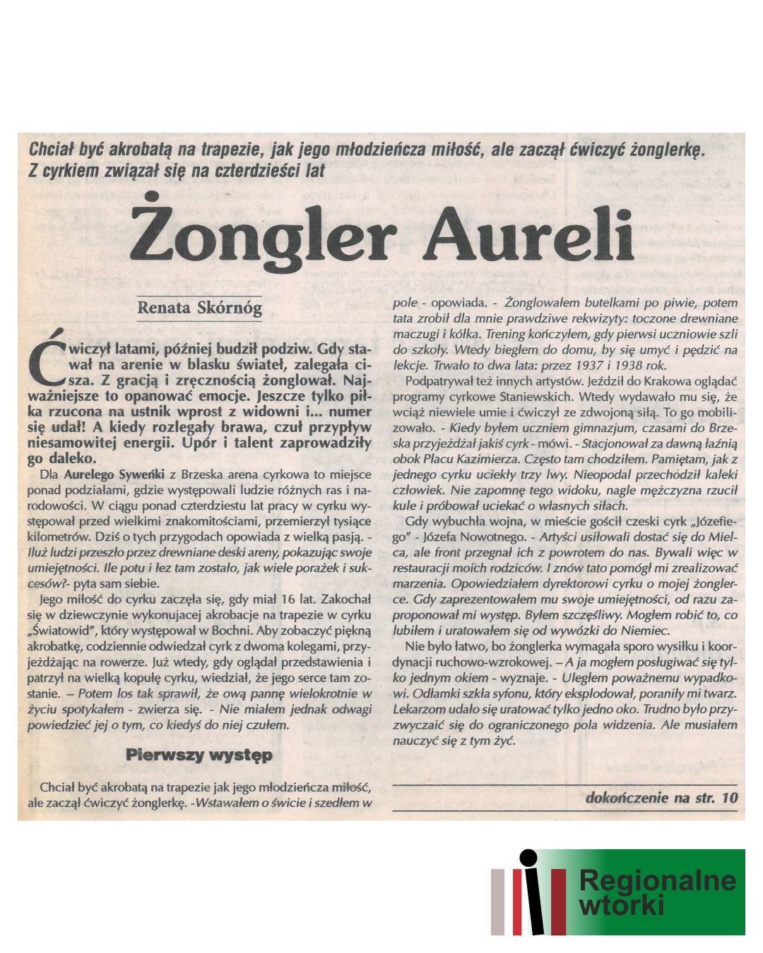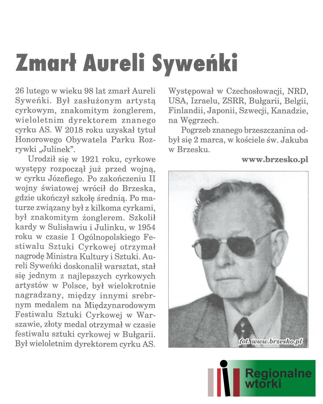W tym roku mija 100. rocznica urodzin Aurelego Syweńkiego, urodzonego 14.04.1921 roku artysty cyrkowego pochodzącego z Brzeska. Sztuką cyrkową zaczął interesować się w gimnazjum za sprawą cyrków przyjeżdżających przed wojną do Brzeska.