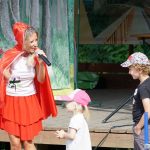 Zabawę rozpoczęliśmy o godzinie 15:00 krótkim pokazem trialu rowerowego, a chwilę później aktorzy z Teatru Blaszany Bębenek „zalali” śmiechem całą publiczność „małą i dużą”. Przedstawiali „czerwonego Kapturka” w tak atrakcyjny sposób, że wszyscy mieliśmy szeroki uśmiech na twarzy i głośno się śmialiśmy. Pouczająca bajeczka niosła ze sobą przesłania profilaktyczne, dzieci uczyły się, że nie należy ufać nieznajomym, nie można być chciwym i łakomym, ale trzeba być dobrym i pomocnym.