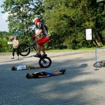 Przez cały czas obok sceny ustawiony był tor, na którym ewolucje na rowerze i motorze wykonywał Mateusz Kowalczyk. Pierwsze oficjalne „wejście” było tuż po teatrzyku. Pasjonat niesamowitej jazdy na rowerze, pokazał jak ona może być dynamiczna, wykonywał skoki i inne ewolucje. Oczywiście na wstępie mówił o zasadach bezpieczeństwa, które swoją osobą potwierdzał na przykład poprzez włożenie kasku na głowę. Opowiadał o swojej pasji i zachęcał do spełniania marzeń. Kilkukrotnie podczas kolejnych wejść, jeździł rowerem lub motorem po torze, samochodzie, skakał na skakance, skokiem zgniatał kubki papierowe i puszki, pokonywał żywe przeszkody. Pierwszym śmiałkiem — żywą przeszkodą — był pan Tomasz, później dołączyli do niego chłopcy Emil i Hubert. Gratulacje dla śmiałków. Mateusz Kowalczyk od początku do samego końca nam towarzyszył, a jego występy sprawiały, że młodsi i nieco starsi widzowie na twarzach mieli rumieńce i szeroko otwierali oczy. Było super.
