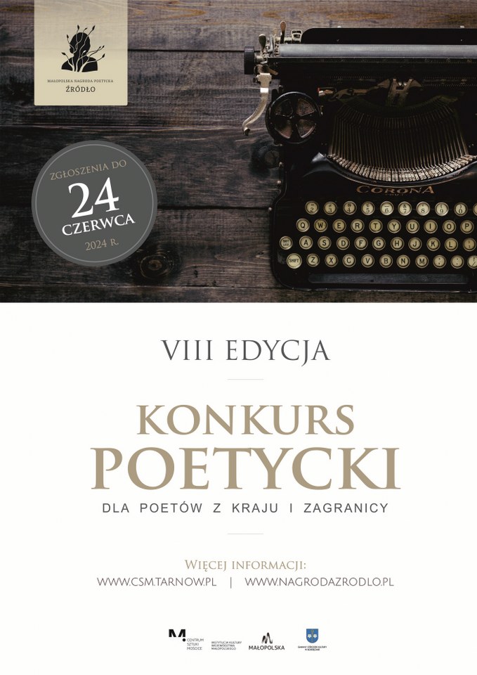 Do poniedziałku 24 czerwca br. można nadsyłać zestawy wierszy na ósmą edycję Małopolskiej Nagrody Poetyckiej „Źródło” oraz czwartą edycję „Małego Źródła”. Pomysłodawcą Konkursu i przewodniczącym jury jest Józef Baran. W komisji zasiadają także: Adam Ziemianin, Beata Paluch i Jadwiga Malina.
