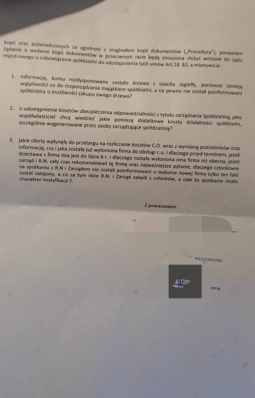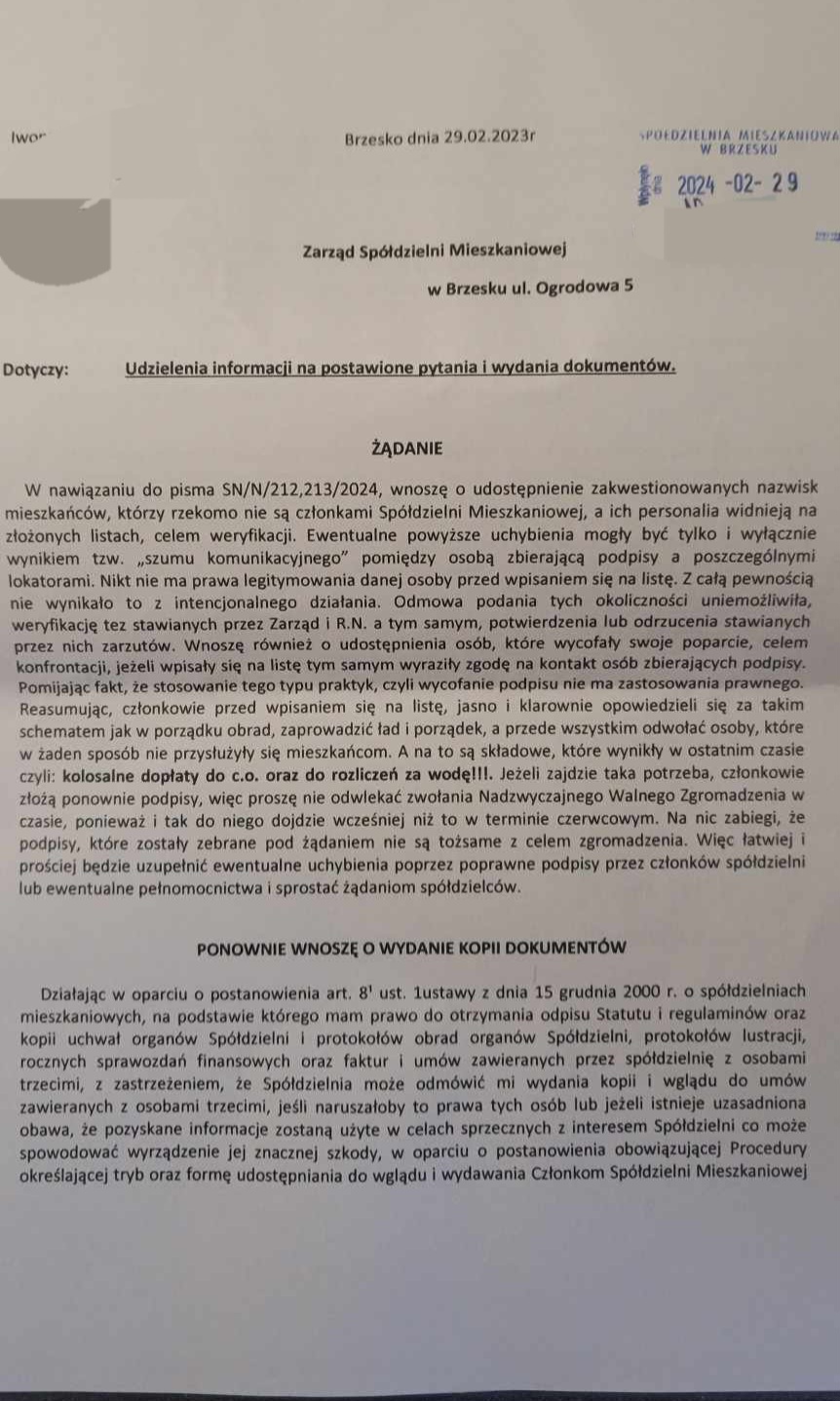 Pismo od członków Spółdzielni Mieszkaniowej w Brzesku do Zarządu