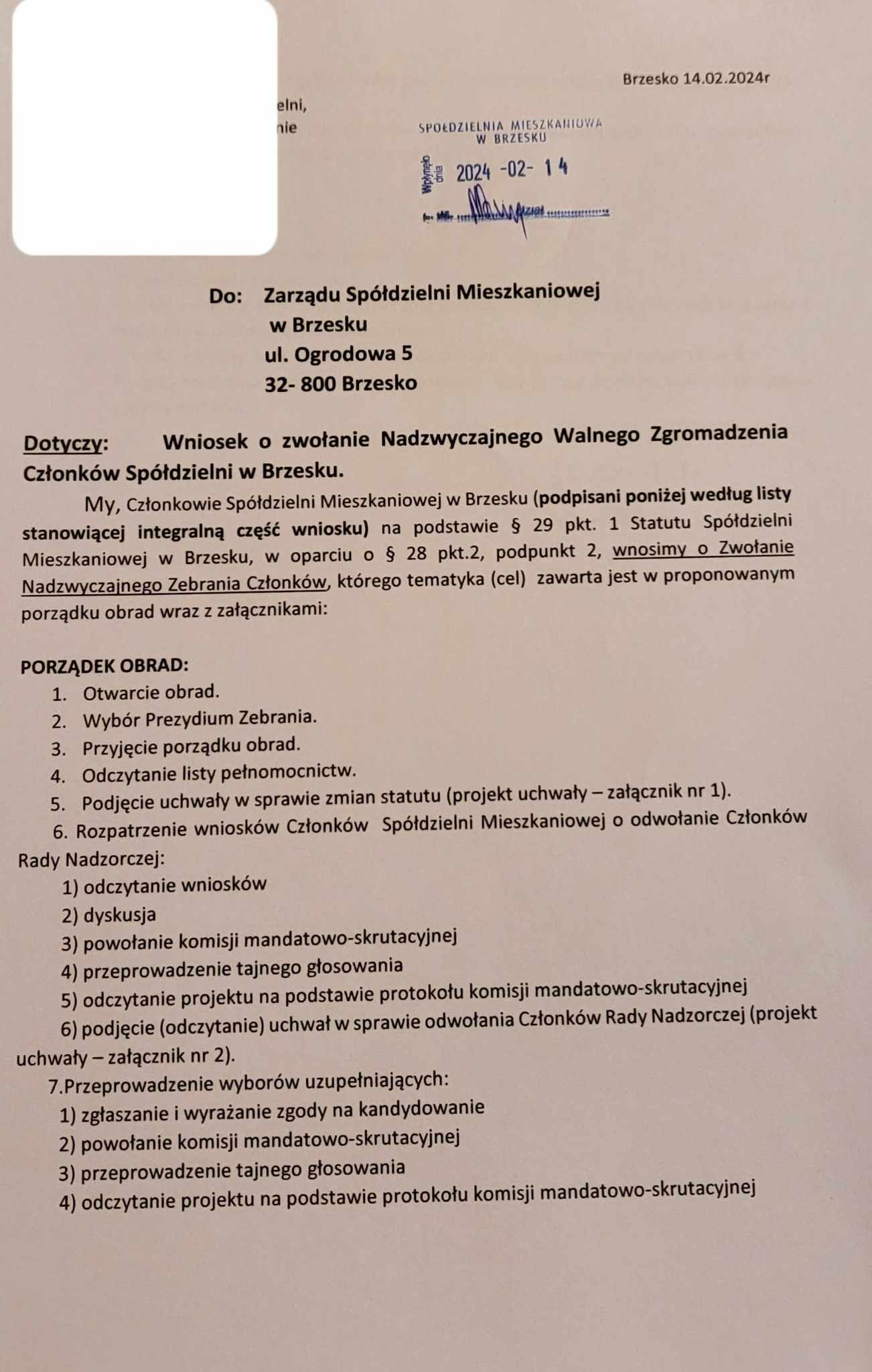 Pismo – w sprawie zwołania Nadzwyczajnego Walnego Zgromadzenia Członków Spółdzielni w Brzesku