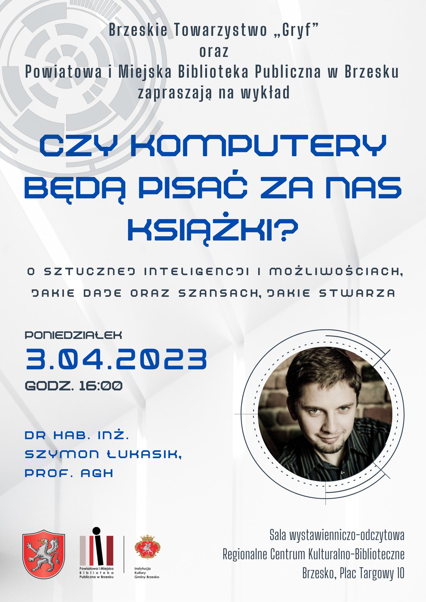 Brzeskie Towarzystwo „Gryf” oraz Powiatowa i Miejska Biblioteka Publiczna w Brzesku zapraszają na wykład prof. Szymona Łukasika „Czy komputery będą pisać za nas książki? O sztucznej inteligencji i możliwościach, jakie daje oraz szansach, jakie stwarza”.