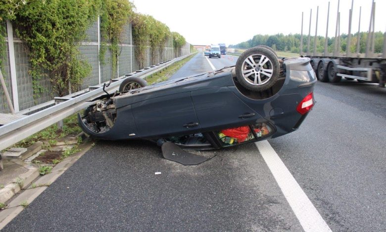 Dachowanie BMW na autostradzie A4 przed węzłem Brzesko / 15 lipca 2022 r.