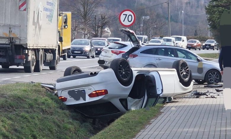 Z nieustalonych na tę chwilę przyczyn samochód osobowy wypadł z jezdni, a następnie dachował.