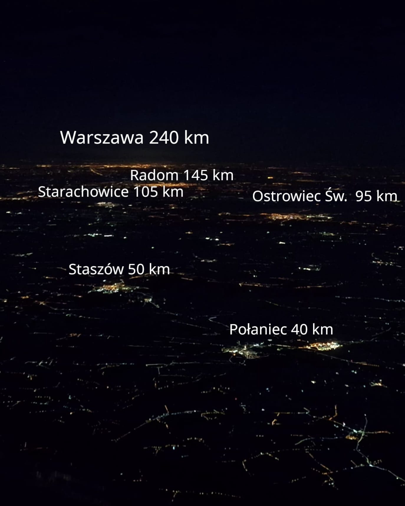 Na zdjęciu widoczny jest Połaniec, Staszów, Starachowice, Ostrowiec Św. , Radom i oczywiscie Warszawa. Na nieco innym ujęciu widać także Kielce. Identyfikację przeprowadził Paweł Kłak – autor i prowadzący portal dalekiewidoki.pl.