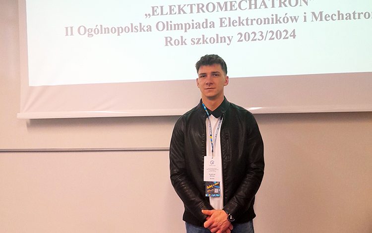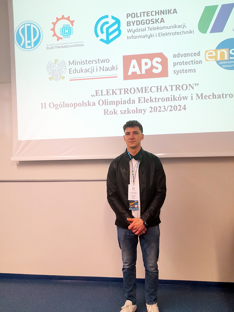 Z radością informujemy, że Dariusz Brzęk, uczeń klasy 5 Mep w Zespole Szkół Technicznych i Branżowych, osiągnął wspaniały sukces w finale Ogólnopolskiej Olimpiady Elektroników i Mechatroników ELEKTROMECHATRON, który odbył się 29 kwietnia 2024 roku na terenie Zachodniopomorskiego Uniwersytetu Technologicznego w Szczecinie.