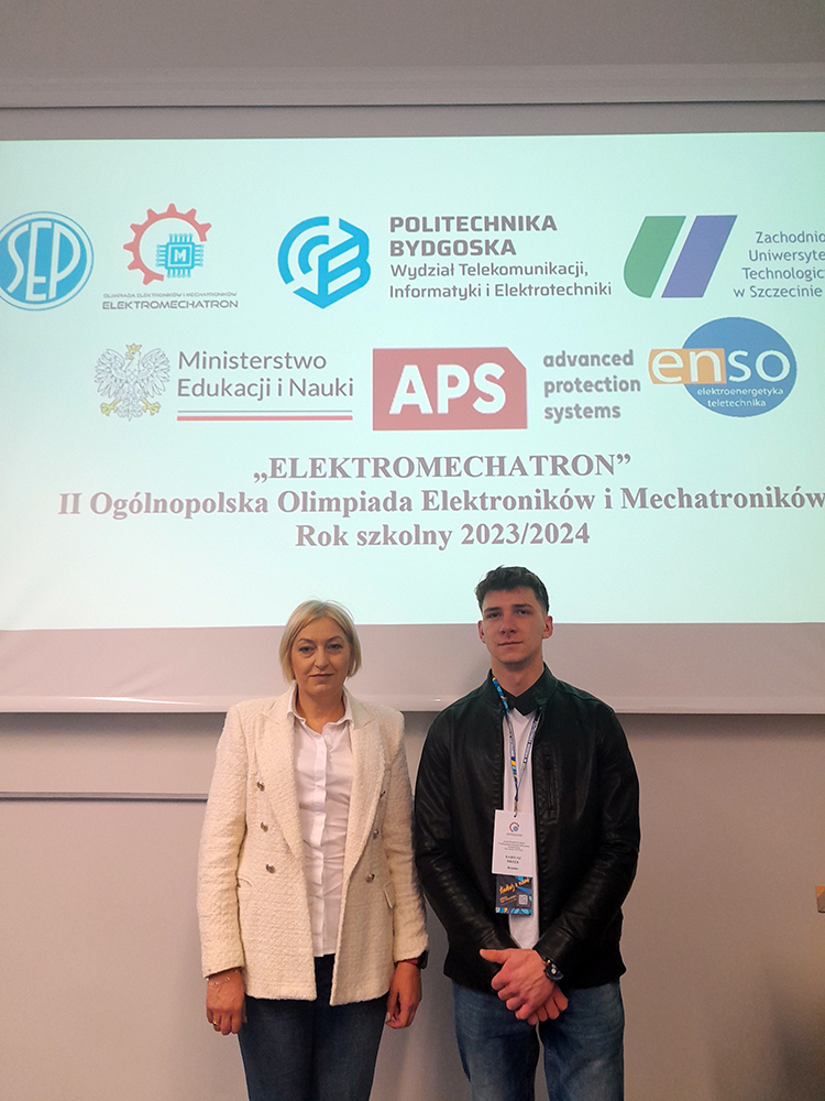 Z radością informujemy, że Dariusz Brzęk, uczeń klasy 5 Mep w Zespole Szkół Technicznych i Branżowych, osiągnął wspaniały sukces w finale Ogólnopolskiej Olimpiady Elektroników i Mechatroników ELEKTROMECHATRON, który odbył się 29 kwietnia 2024 roku na terenie Zachodniopomorskiego Uniwersytetu Technologicznego w Szczecinie.