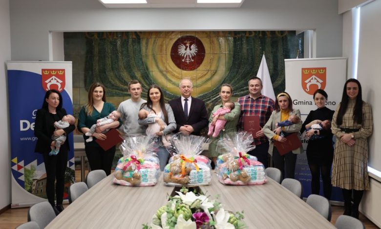 Wójt gminy Dębno Wiesław Kozłowski wraz z kierownikiem Wydziału Spraw Obywatelskich, Sportu i Promocji Anną Jakubas wręczył symboliczne prezenty dla: Liwii, Martyny, Niny, Alicji, Aleksandry, Antoniny, Oliwii, Seweryna, Mikołaja, Szymona, Borysa oraz Oktawiana.