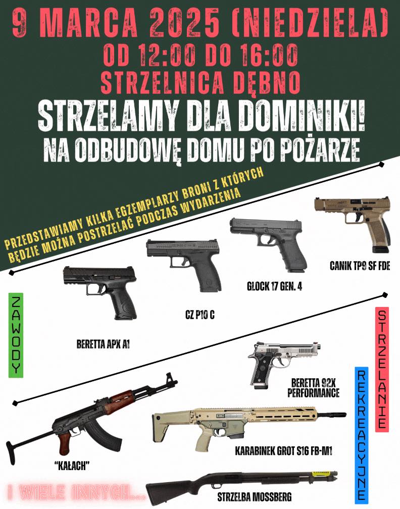 Czas połączyć siły w szczytnym celu! Serdecznie zapraszamy wszystkich – zarówno doświadczonych strzelców, jak i tych, którzy dopiero chcą spróbować swoich sił – na Charytatywne Zawody Strzeleckie. Podczas wydarzenia będziemy zbierać fundusze na odbudowę domu policjantki Dominiki, który został zniszczony w wyniku pożaru. To także wyjątkowa okazja, by wspólnie świętować 100 lat kobiet w Policji – rocznicę, która przypomina o sile, determinacji i odwadze funkcjonariuszek służących w naszym kraju.
