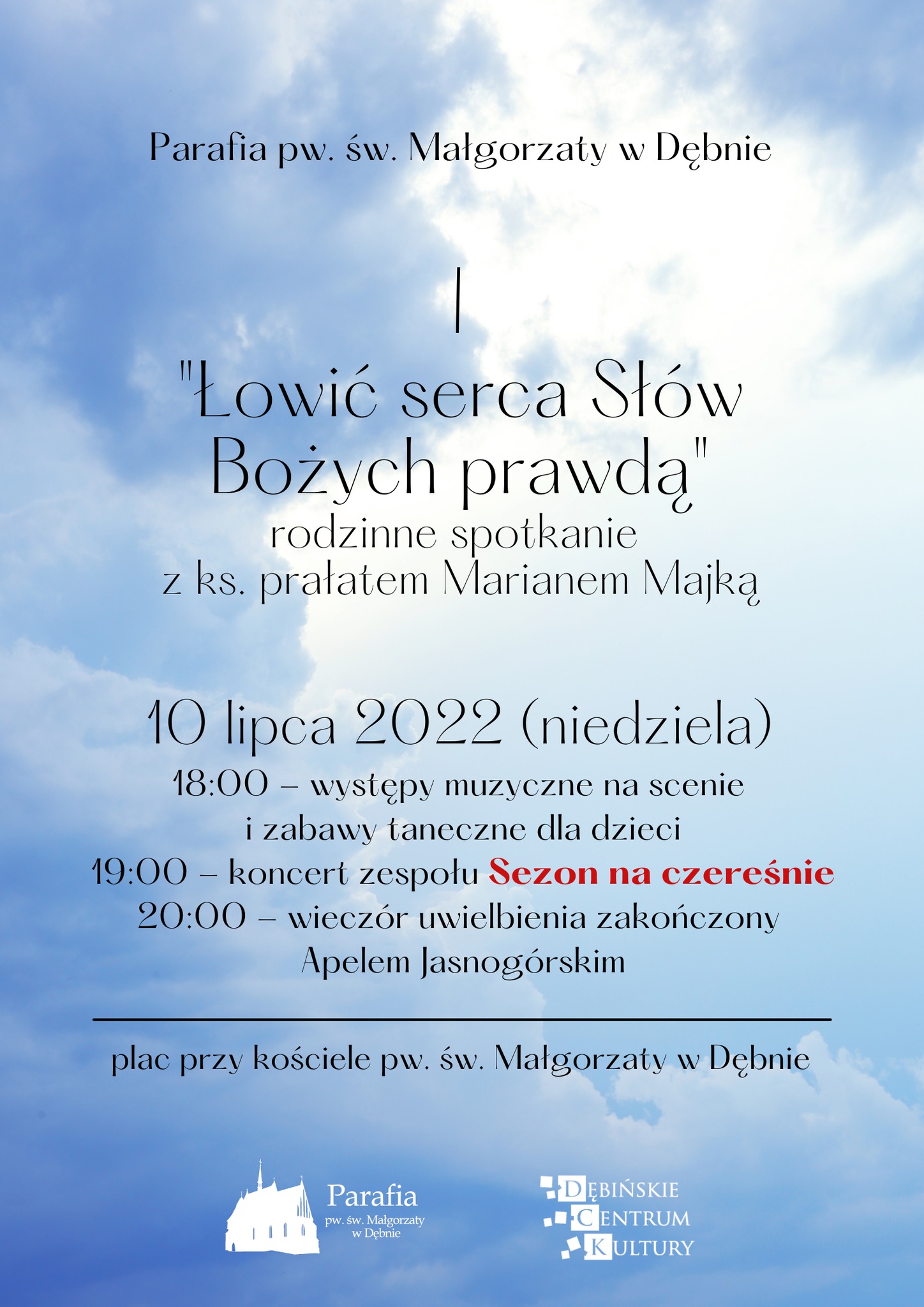 W niedzielny wieczór 10 lipca 2022 r. Parafia pw. Św. Małgorzaty zapraszamy na plac przed kościołem parafialnym w Dębnie na wydarzenie „Łowić serca Słów Bożych prawdą”, dedykowane ks. prałatowi Marianowi Majce.