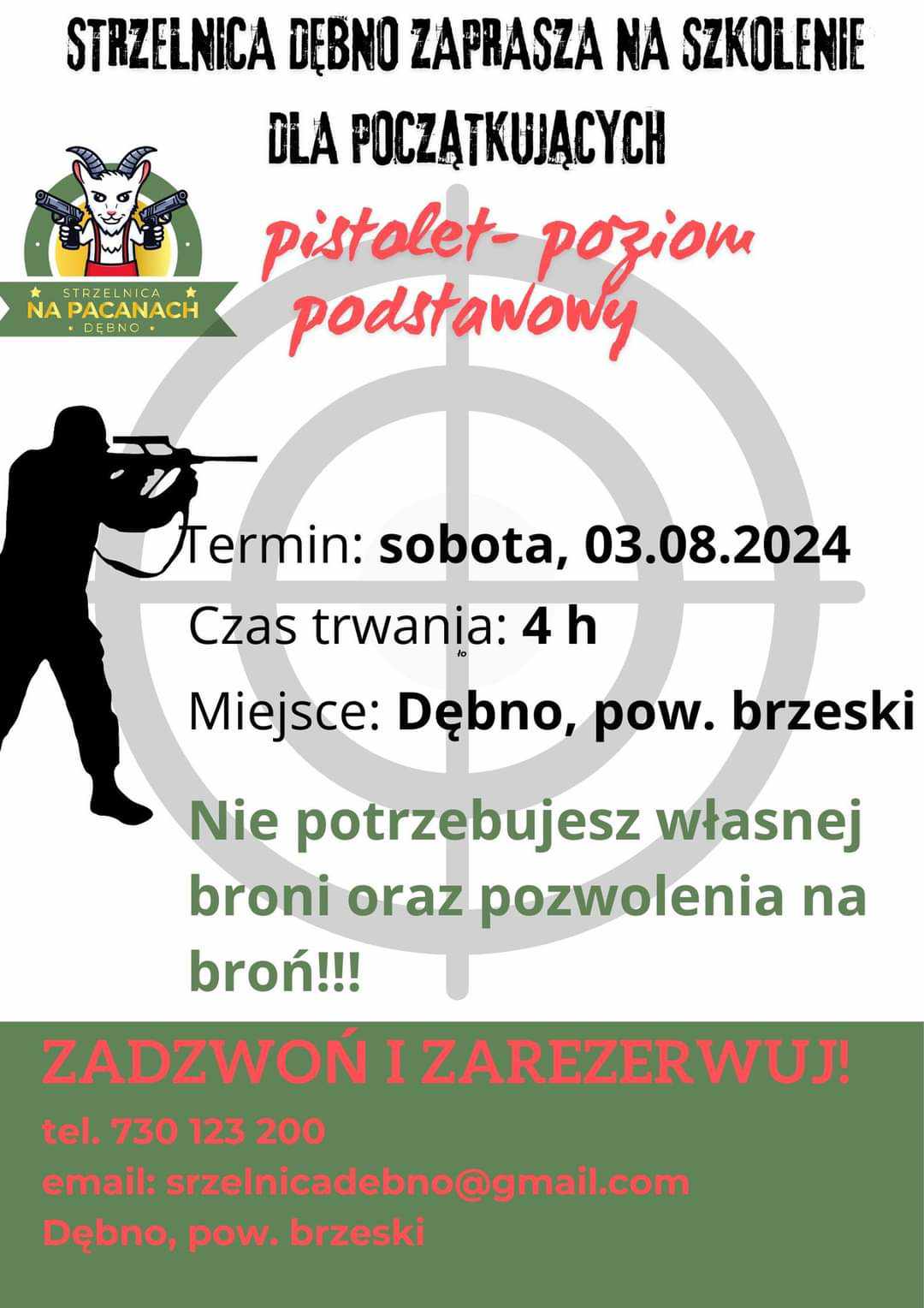 Już w najbliższą sobotę 3 sierpnia 2024 roku odbędzie się szkolenie a posługiwania się pistoletem dla osób które nigdy wcześniej nie miały kontaktu z bronią palną.