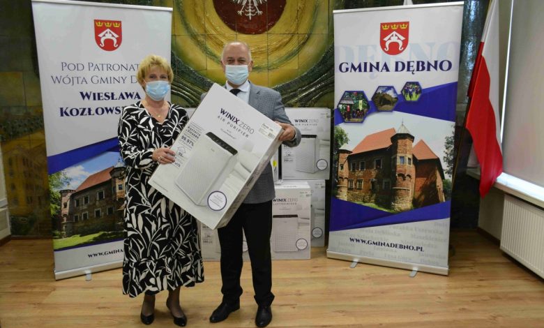 Dbając o zdrowie dzieci, 9 sztuk oczyszczaczy powietrza trafiło do szkół podstawowych znajdujących się na terenie gminy Dębno. W poniedziałek 27 września 2021 r. dyrektorzy placówek, odebrali urządzenia z rąk Wiesława Kozłowskiego wójta Gminy Dębno.