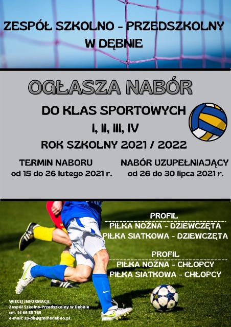 W Zespole Szkolno-Przedszkolnym w Dębnie ruszyła rekrutacja do klas sportowych na rok szkolny 2021/2022. Planowane jest otwarcie oddziałów o specjalności piłka siatkowa oraz piłka nożna – zarówno dla chłopców, jak i dziewczynek. Zgłoszenia przyjmowane są do 26 lutego 2021 r. Rozwój fizyczny, jaki zapewniają klasy sportowe sprawia, że uczniowie odnoszą sukcesy nie tylko w sporcie, ale także w innych sferach życia.