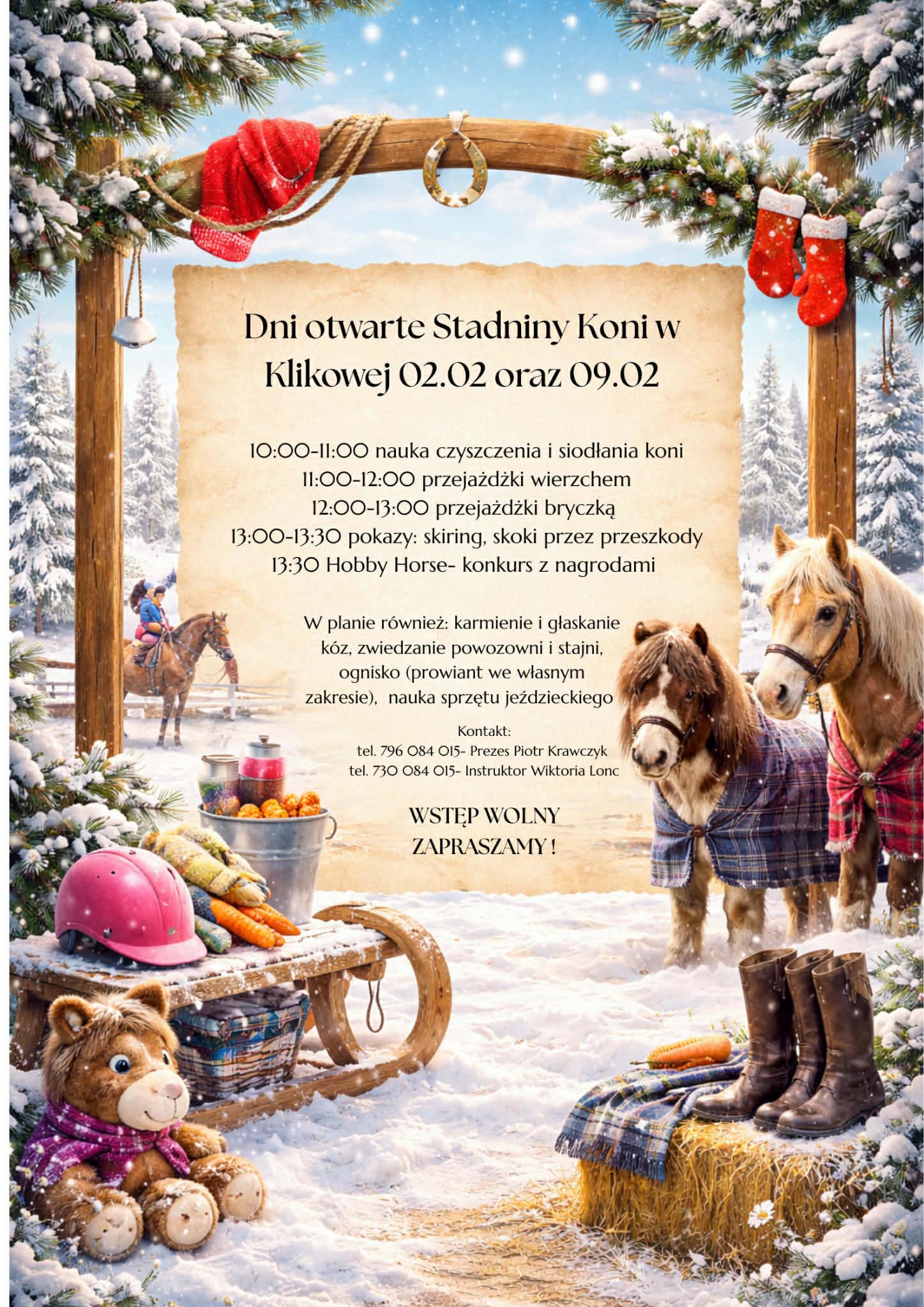 Zapraszamy dzieci, młodzież i dorosłych na Dni Otwarte w Stadninie Koni w Klikowej. W feryjne poniedziałki 2 i 9 lutego 2026 r. przygotowano szereg atrakcji dla dzieci i młodzieży. To doskonała okazja, by z bliska poznać konie, nauczyć się podstaw jeździectwa i spędzić czas w prawdziwie wiejskim klimacie.