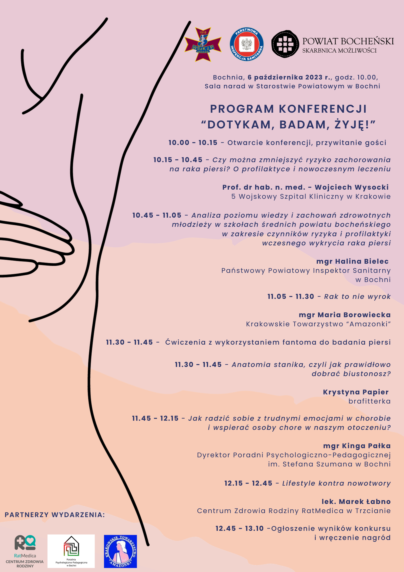 Państwowy Powiatowy Inspektor Sanitarny w Bochni wspólnie ze Starostą Bocheńskim zapraszają do udziału w konferencji „Dotykam, badam, żyję!”, dotyczącą profilaktyki raka piersi. Konferencja odbędzie 6 października o godz. 10.00 w sali narad w Starostwie Powiatowym w Bochni.