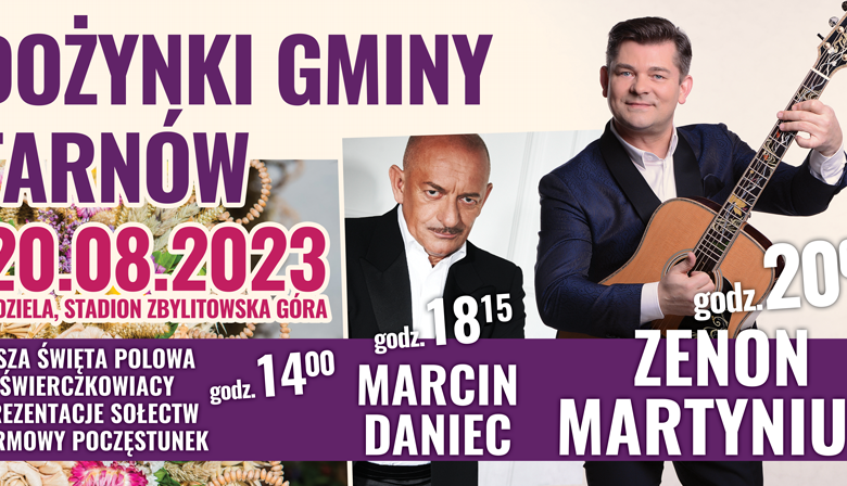O godz. 18.15 na scenie pojawi się znany i lubiany kabaret Marcina Dańca, godzinę później zaplanowano Muzyczny Jubileusz Gminy Tarnów, a o 20.15 wystąpi legenda disco polo – Zenon Martyniuk! Po 21.00 natomiast rozpocznie się Biesiada Taneczna z Zespołem Feniks.