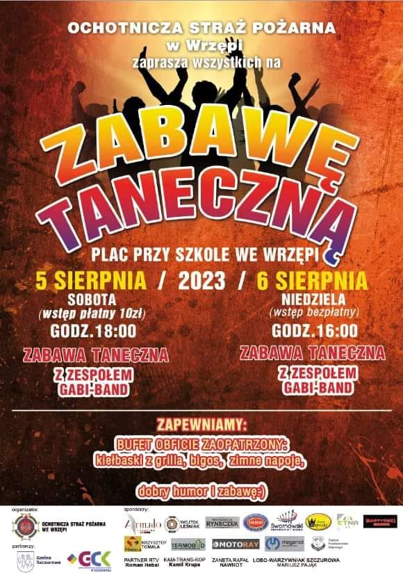 Ochotnicza Straż Pożarna z Wrzępi zaprasza na dwudniową zabawę taneczną. W sobotę 5 sierpnia 2023 r. impreza startuje o godz. 18.00, a w niedzielę o godz. 16.00. Zabawa odbędzie się na placu przed szkołą.