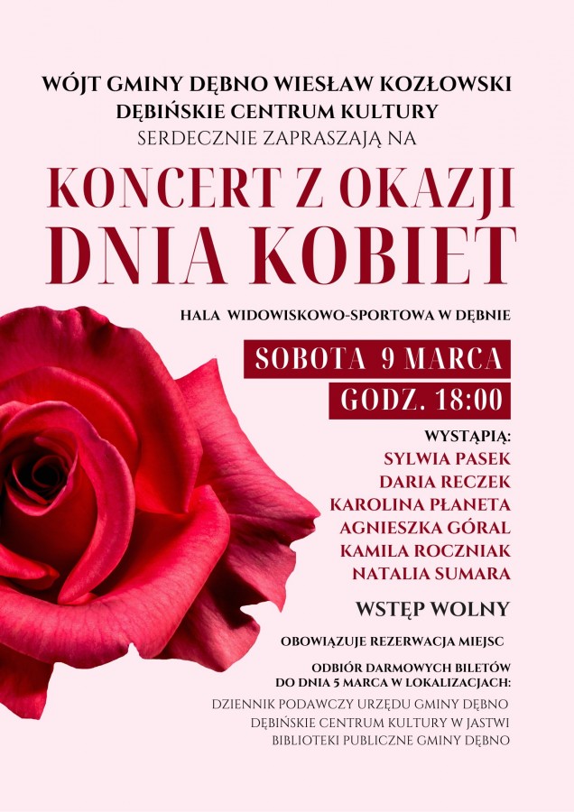 Wójt Gminy Dębno Wiesław Kozłowski oraz Dębińskie Centrum Kultury zapraszają na wyjątkowy koncert z okazji Dnia Kobiet.