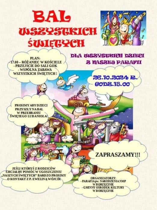 – Wykorzystajmy ten czas na przygotowanie strojów świętych dla dzieci. Zapraszam rodziców do współpracy z Akcją Katolicką w przeprowadzeniu tego balu. Dzieci zapraszam w strojach pół godz. przed różańcem. Każde dziecko przedstawi wybranego świętego – zachęcają duszpasterze z Parafii w Borzęcinie Górnym.