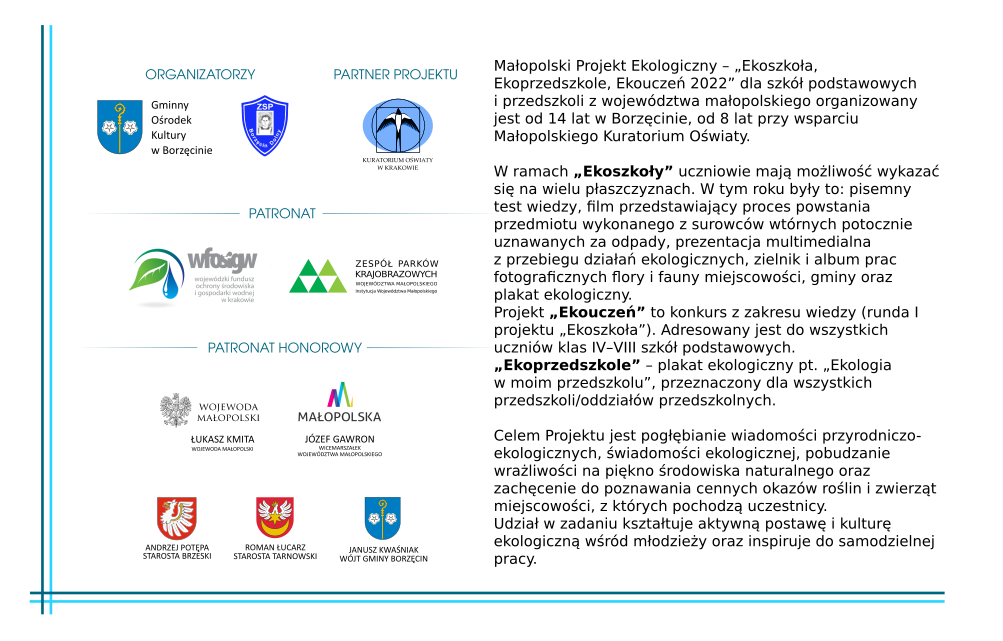 Honorowy patronat nad zadaniem sprawują: Łukasz Kmita – Wojewoda Małopolski, Józef Gawron – Wicemarszałek Województwa Małopolskiego, Kazimierz Koprowski – Prezes Zarządu Wojewódzkiego Funduszu Ochrony Środowiska i Gospodarki Wodnej w Krakowie, Starosta Powiatu Brzeskiego Andrzej Potępa, Starosta Powiatu Tarnowskiego Roman Łucarz, Wójt Gminy Borzęcin Janusz Kwaśniak oraz instytucje: Wojewódzki Fundusz Ochrony Środowiska i Gospodarki Wodnej w Krakowie oraz Zespół Parków Krajobrazowych Województwa Małopolskiego.