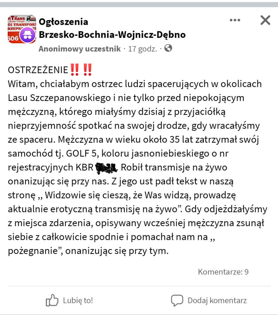 Gdy odjeżdżałyśmy z miejsca zdarzenia, opisywany wcześniej mężczyzna zsunął siebie z całkowicie spodnie i pomachał nam na ,, pożegnanie”, onanizując się przy tym – napisała w ostrzeżeniu anonimowa uczestniczka w grupie Ogłoszenia Brzesko-Bochnia-Wojnicz-Dębno.