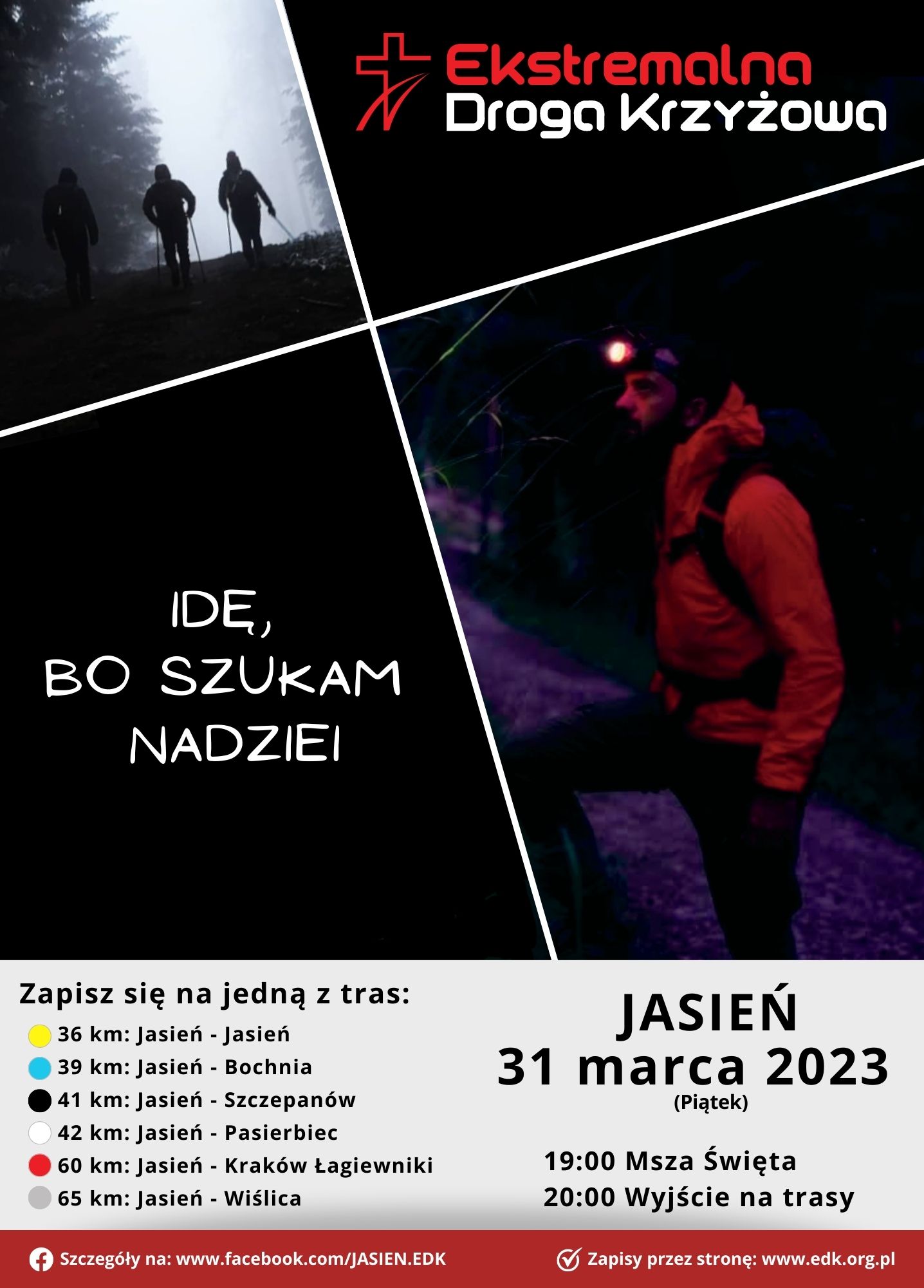 Ekstremalna Droga Krzyżowa odbędzie się 31 marca 2023 roku. Tradycyjnie w Jasieniu w Parafii Wniebowzięcia Najświętszej Maryi Panny przygotowano szereg tras dla pątników z regionu. Jest to już ósma edycja projektu. W naszym regionie cieszy się ona niegasnącą popularnością, czego potwierdzeniem jest stała liczba uczestników przekraczająca 350 osób!
