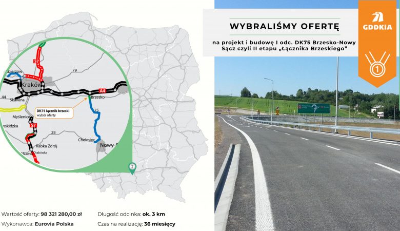 Spośród sześciu wykonawców, którzy złożyli oferty do przetargu na zaprojektowanie i wybudowanie pierwszego odcinka drogi krajowej DK75 Brzesko – Nowy Sącz, przebiegającego po zachodniej stronie Brzeska i będącego kontynuacją łącznika z autostradą A4 oddanego do ruchu w 2016 r. Jako najkorzystniejsza wybrana została oferta firmy Eurovia Polska. Koszt prac został wyceniony przez wykonawcę na 98 321 280,00 zł. Na realizację zadania wykonawca będzie miał 36 miesięcy – a więc nową droga pojedziemy najpóźniej w listopadzie 2023 r.