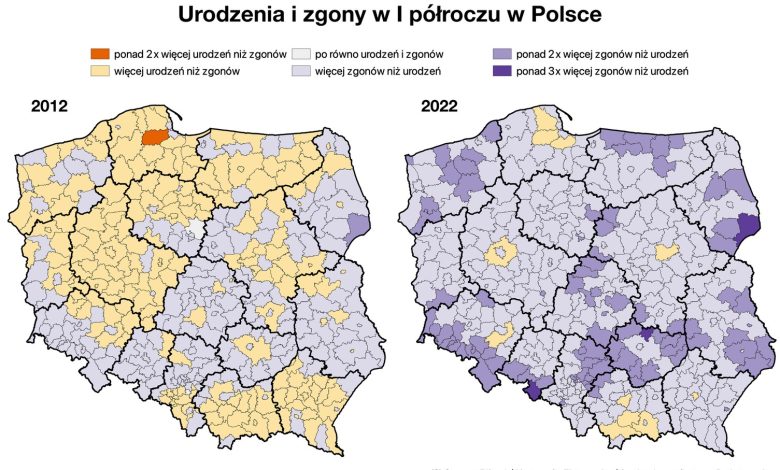 Porównajmy urodzenia i zgony w I półroczu ubiegłego roku z analogicznym okresem 10 lat wcześniej. W I półroczu 2012 liczba zgonów była nieznacznie wyższa niż urodzeń (194 tys. wobec 192,2 tys.). Polska była podzielona dokładnie po połowie: 180 powiatów miało więcej zgonów niż urodzeń, a 180 tyle samo lub mniej. W jednym powiecie (hajnowskim) było dwa razy więcej zgonów niż urodzeń, za to w kartuskim – na odwrót.