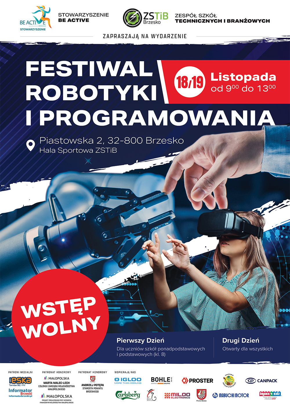 Zespół Szkół Technicznych i Branżowych w Brzesku wspólnie z lokalnymi zakładami pracy, partnerami w kształceniu zawodowym organizuje Festiwal Robotyki i Programowania, który odbędzie się 18 i 19 listopada br.