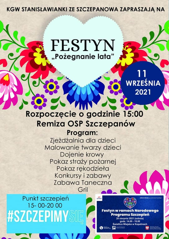 W sobotę 11 września 2021 r. Koło Gospodyń Wiejskich „Stanisławianki” ze Szczepanowa organizuje festyn na pożegnanie lata. To jedna z ostatnich okazji na plenerową zabawę, a jak wskazują prognozy — będzie to ostatni tak ciepły weekend. Organizatorki szykują sporo atrakcji, a dodatkowo będzie można się zaszczepić przeciwko koronawirusowi.