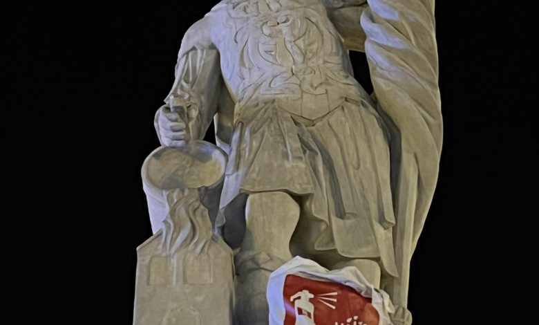 Przypomnijmy – do skandalu doszło we wtorek 12 grudnia 2023 r. po południu w Sejmie. W budynku sejmu odbywała się uroczystość poświęcona żydowskiemu świętu Chanuki. Poseł Konfederacji Grzegorz Braun chwycił za gaśnicę i zgasił świece chanukowe. W efekcie doszło także do słownej awantury na sali plenarnej. W sieci pojawiło się sporo gadżetów związanych z tym zdarzeniem – jeden z nich trafił z bliżej nieokreślonego powodu na cokół pomnika św. Floriana.