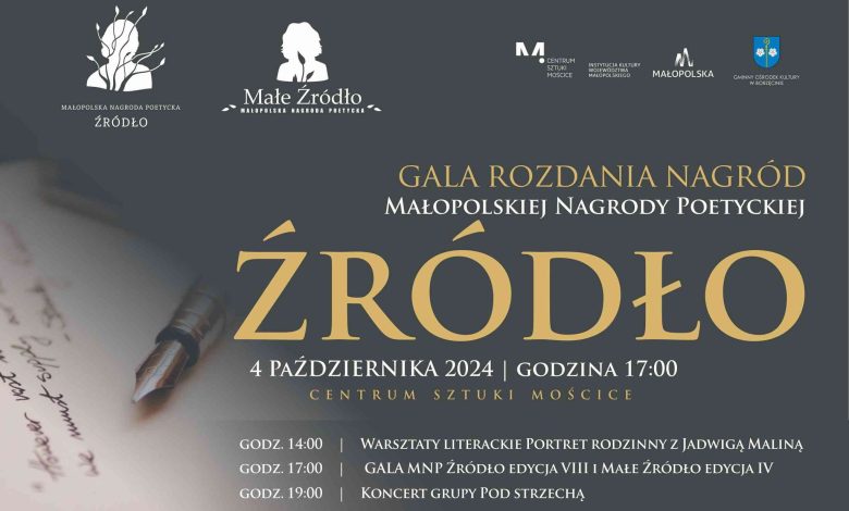 W piątek 4 października 2024 r. o godz. 17:00 na galę finałową Małopolskiej Nagrody Poetyckiej „Źródło” i „Małe Źródło”. Wstęp wolny!