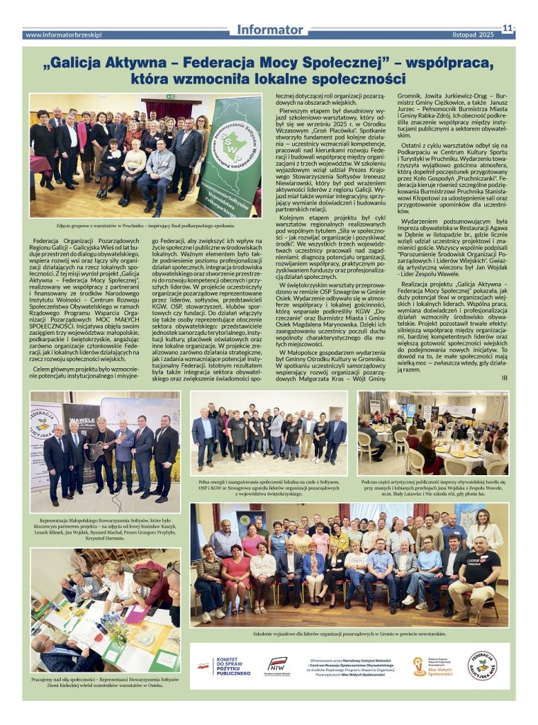 Federacja Organizacji Pozarządowych Regionu Galicji – Galicyjska Wieś od lat buduje przestrzeń do dialogu obywatelskiego, wspiera rozwój wsi oraz łączy siły organizacji działających na rzecz lokalnych społeczności. Z tej misji wyrósł projekt „Galicja Aktywna – Federacja Mocy Społecznej”, realizowany we współpracy z partnerami i finansowany ze środków Narodowego Instytutu Wolności – Centrum Rozwoju Społeczeństwa Obywatelskiego w ramach Rządowego Programu Wsparcia Organizacji Pozarządowych MOC MAŁYCH SPOŁECZNOŚCI. Inicjatywa objęła swoim zasięgiem trzy województwa: małopolskie, podkarpackie i świętokrzyskie, angażując zarówno organizacje członkowskie Federacji, jak i lokalnych liderów działających na rzecz rozwoju społeczności wiejskich.