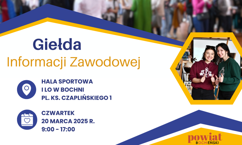Czy wiesz, co chciałbyś robić po skończeniu szkoły? Jeśli szukasz inspiracji i chcesz poznać opisy zawodów, ścieżki edukacyjne, istotne wymagania czy środowisko pracy- serdecznie zapraszamy na Giełdę Informacji Zawodowej dla Ósmoklasistów. Giełda odbędzie się w najbliższy czwartek 20 marca w hali sportowej I LO w Bochni w godzinach 9:00-17:00.