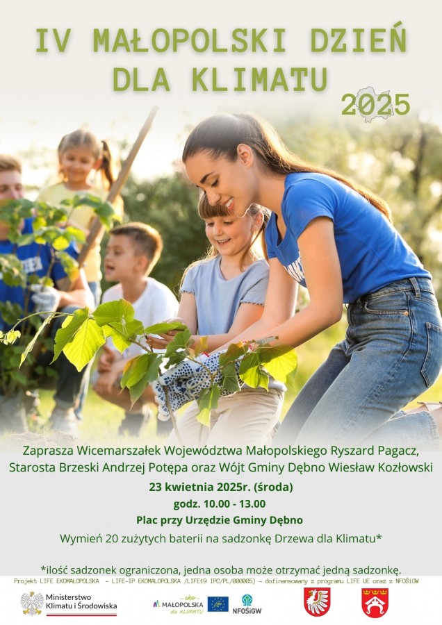 W środę 23 kwietnia 2025 r. od godziny 10:00 na terenach zielonych przed Urzędem Gminy rozpocznie się wydarzenie „IV Małopolskie Dni dla Klimatu”. Jest to inicjatywa mająca na celu zwiększenie świadomości ekologicznej mieszkańców Małopolski poprzez sadzenie drzew oraz działania edukacyjne związane z ochroną środowiska i przeciwdziałaniem zmianom klimatu.