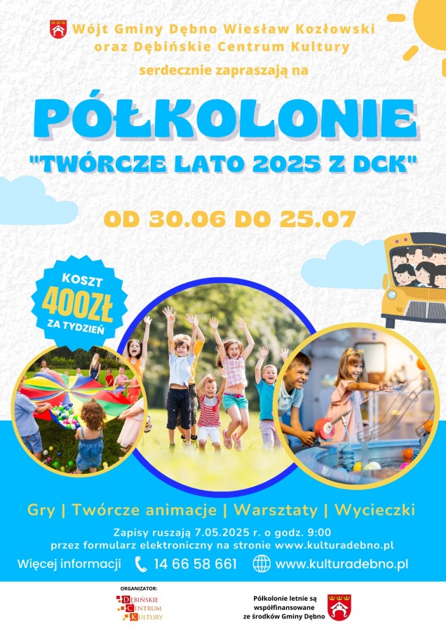 Wójt Gminy Dębno Wiesław Kozłowski wraz z Dębińskim Centrum Kultury zapraszają dzieci z klas 1-8 szkół podstawowych z terenu Gminy Dębno do udziału w półkoloniach letnich „Twórcze Lato 2025 z DCK”. Zajęcia odbywać się będą w Dębińskim Centrum Kultury w Jastwi w terminie od 30 czerwca do 25 lipca 2025 r., od poniedziałku do piątku, w ramach czterech tygodniowych turnusów, w godzinach od 8:00 do 16:00. Koszt udziału w jednym turnusie wynosi 400 zł i obejmuje m.in. ciepły posiłek oraz ubezpieczenie NNW.