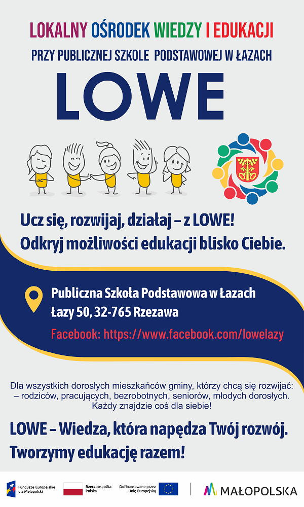 Gmina Rzezawa jest wnioskodawcą projektu pn. ”Utworzenie Lokalnego Ośrodka Wiedzy i Edukacji na rzecz aktywizacji osób dorosłych przy Zespole Szkolno-Przedszkolnym w Łazach” współfinansowanego ze środków Unii Europejskiej w ramach Programu Fundusze Europejskie dla Małopolski 2021-2027.