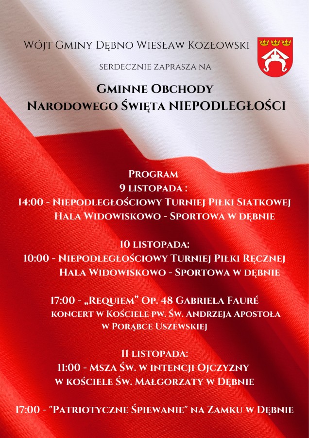 Wójt Gminy Dębno Wiesław Kozłowski serdecznie zaprasza wszystkich mieszkańców do uczczenia kolejnej rocznicy odzyskania przez Polskę niepodległości i udziału w przygotowanych z tej okazji wydarzeniach.