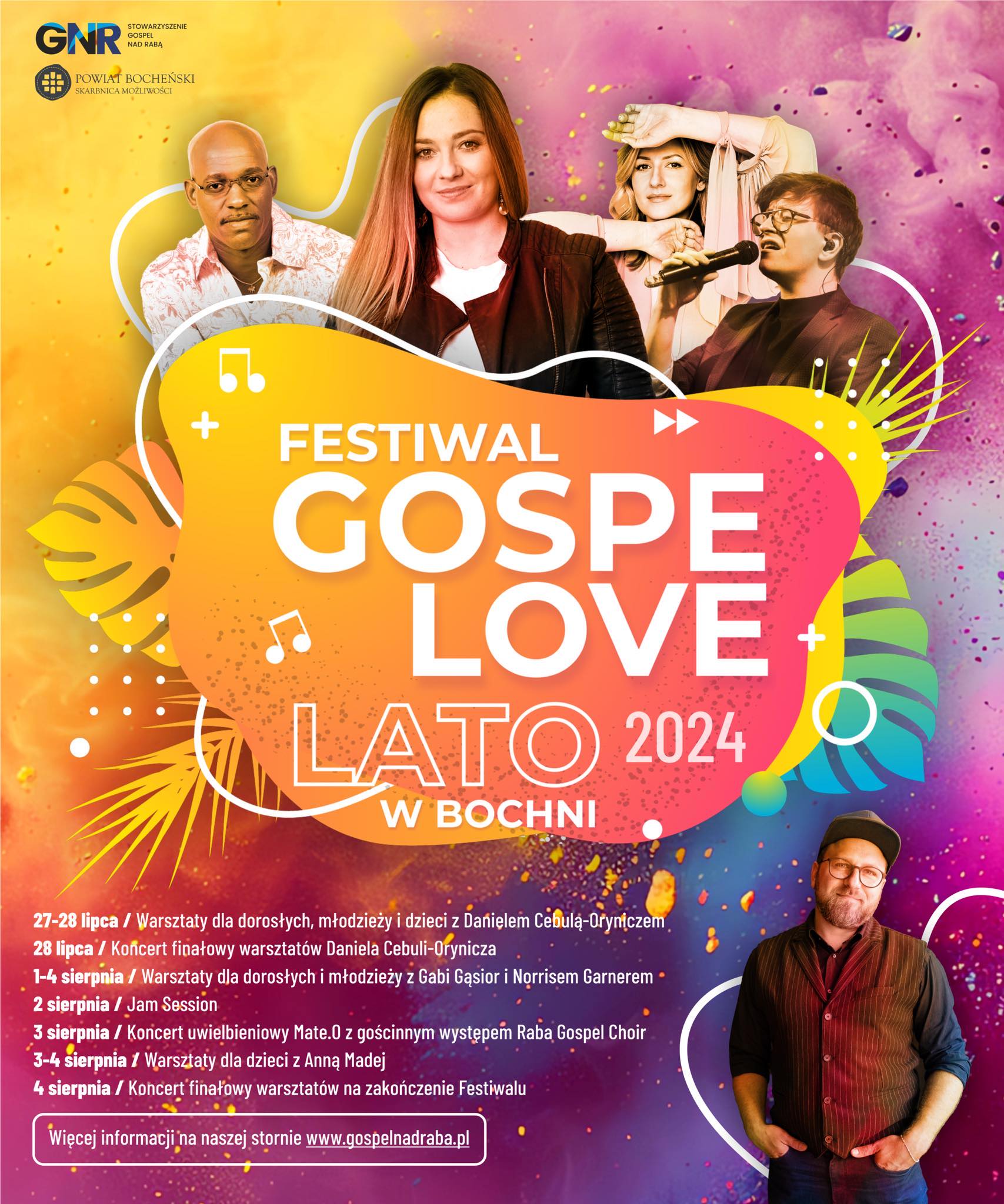 Na przełomie lipca i sierpnia 2024 r. muzyka gospel kolejny raz opanuje Bochnię. To już czwarta edycja bocheńskich warsztatów gospel, organizowana przez Stowarzyszenie Gospel nad Rabą we współpracy z Powiatem Bocheńskim. Wydarzenie GospeLOVE Lato w tym roku ponownie przybierze formę festiwalu, składającego się z trzech odsłon warsztatów oraz dwóch koncertów.