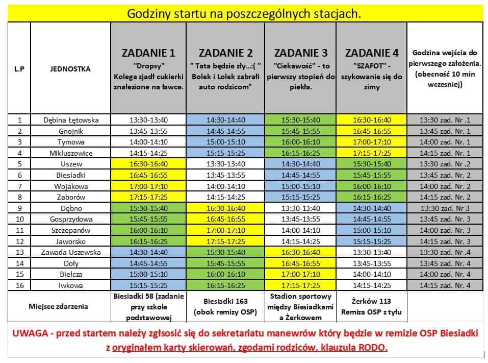 13.00-17:30 Starty drużyn na poszczególnych stacjach ćwiczeniowych w miejscowościach Biesiadki i Żerków według kart startu.