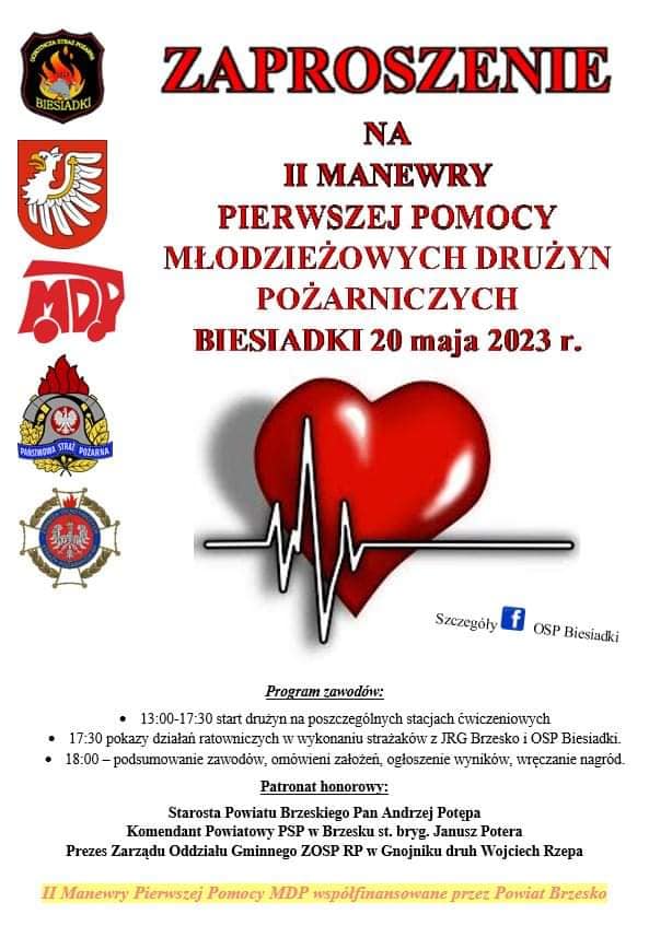 Strażacy z jednostki OSP Biesiadki zapraszają w najbliższą sobotę 20 maja 2023 r. na drugą edycję powiatowych Manewrów Pierwszej Pomocy Młodzieżowych Drużyn Pożarniczych. Zmagania rozpoczną się o godzinie 13.00. W manewrach weźmie udział 16 Młodzieżowych Drużyn Pożarniczych z terenu Powiatu Brzeskiego oraz dwie drużyny z ościennych powiatów – bocheńskiego oraz tarnowskiego.