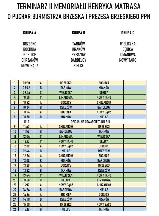 Przed turniejem o godzinie 8:00 w kościele parafialnym pw. Św. Jakuba w Brzesku odprawiona zostanie Msza Święta w intencji Śp. Henia Matrasa.